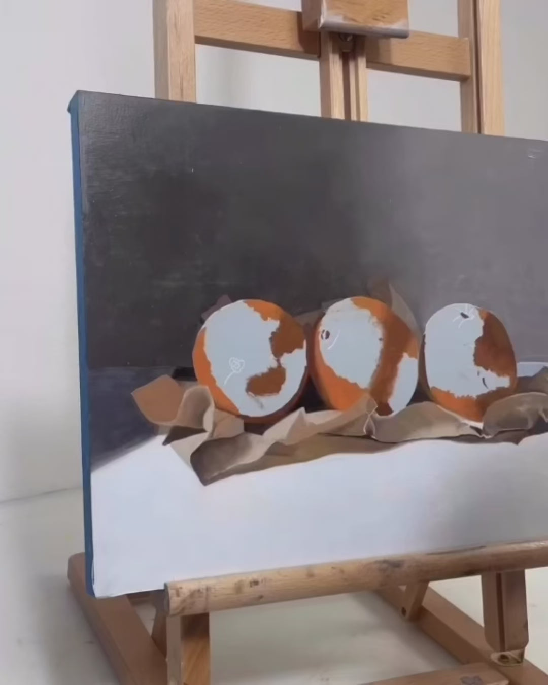 This painting features Three oranges on crumpled paper on a table.