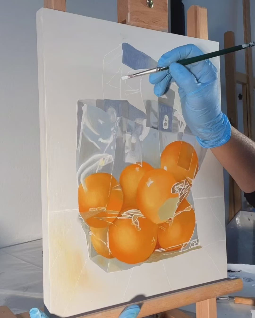 This painting features a transparent plastic bag, with 7 oranges on a table